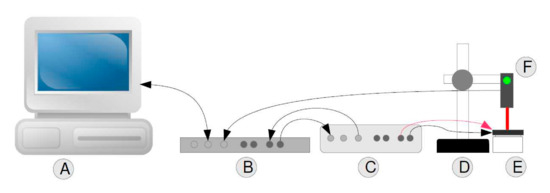 In-house data acquisition system. (A) computer with LabView, (B) data acquisition system (SC-2345), (C) current amplifier, (D) stand for the distance sensor, (E) measurement device and (F) distance sensor.