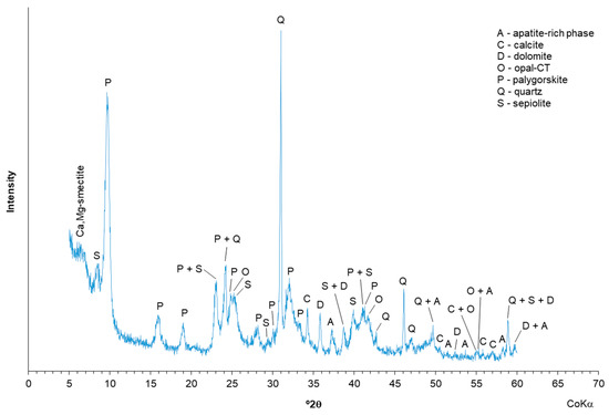The mineralogical composition of the studied palygorskite sample showed the presence of palygorskite as the main clay mineral and a wide range of contaminants, such as quartz, opal-CT (hydrated cristobalite and/or tridymite), calcite, dolomite, and sepiolite. A residual apatite-rich phase (hydroxylapatite-fluorapatite) was also discriminated. In the ~15.0–15.3 Å region, a not well-resolved maximum possibly related with the presence of vestigial Mg,Ca-smectite occurred (Figure 1).