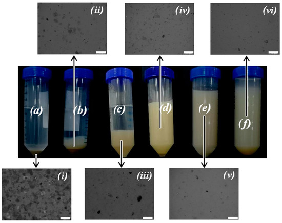 1.0 wt % palygorskite aqueous suspensions (pH ca. 8). (a) Magnetically stirred; (b) magnetically stirred with 0.1 wt % polyphosphate; (c) high-shear dispersed; (d) high-shear dispersed with 0.1 wt % polyphosphate; (e) sonicated; (f) sonicated with 0.1 wt % polyphosphate. (i) Bottom phase of the suspension in (a); (ii) bottom phase of the suspension in (b); (iii) bottom phase of the suspension in (c); (iv) the suspension in (d); (v) the suspension in (e); (vi) the suspension in (f). The images (photographs and micrographs) were taken 20 days after sample preparation. The scale bar in the insets (i)–(vi) represent 100 µm.