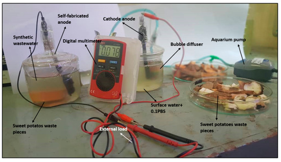 The inoculation source was synthetic wastewater and sweet potato waste material. The sweet potato waste material was collected from a local market, washed gently and cut into pieces. The sweet potato pieces were used directly in an anode chamber instead of crushed sweet potato waste to serve as an organic substrate for bacterial respiration. On the other hand, the wastewater was collected from a local Humna Geulgor pond which was treated with 100 ppm cadmium and lead ions. The treated wastewater was labelled as synthetic wastewater in the present work. The physiochemical characteristics of the wastewater and synthetic wastewater were also analyzed, which is shown in Table 1. The pH meter (EUTECH instrument-700; New York, NY, USA), electrical meter (ECM) (Alpha-800 conductivity meter; Vernon Hills, IL, USA), and thermometer (GH, ZEAL LTD; London, UK) were used to analyze the pH, conductivity, and temperature.