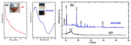 (a) UV- absorbance spectra and (b) X-ray diffraction (XRD) spectra of prepared GO and GO-PANI nanocomposite.