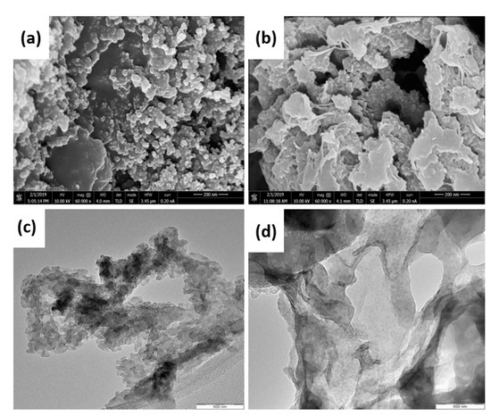 Further, TEM analysis was carried out to demonstrate the GO sheet structure, which has several scrolls and wrinkles as shown in Figure 4c. The TEM image of GO shows the excellent transparency level, which corresponds to the successful oxidation of carbon. The GO structure showed a thin film structure with a distinctive folding nature because the conjugated GO structure was destroyed during the oxidation. However, Figure 4d shows bit tubular morphology in the composite material, which indicates the presence of PANI. Some flaky structures are also found, which also indicates the successful polymerization of aniline and composite formation with the GO sheet [43]. This nanocomposite formation was successful as the electrode is expected to enhance the electron transportation and collection of electrons.