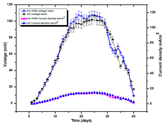 The self-fabricated anodes GO and GO-PANI were used in BMFCs to observe the voltage generation trend. Each experiment was operated for 40 days in the presence of local waste as an organic substrate (sweet potato waste). In the first 5 days of the operation of both the electrodes, a minor difference in voltage generation was observed, but with the passage of time the voltage generation difference increased. For example, on day 5 the GO showed 17 mV and GO-PANI showed 19 mV, which is a minor difference, but on day 25 GO showed 107 mV (0.107 mA) and GO-PANI exhibited 125 mV (0.125 mA). The voltage trend increased gradually in both cases, but the GO-PANI showed quite high voltage generation as compared to unmodified GO. This means that the voltage gradually increased because the supplied organic waste oxidized slowly by bacterial community. The results obtained from the GO-PANI nanocomposite demonstrated that the introduction of PANI increased the electron transportation and it was also biocompatible, which does not show any toxicity towards living microorganisms. The operation of both the electrodes was carried out until the voltage trend deceased. Both electrodes showed a decreasing trend of voltage generation after 25 days, and on day 40 the voltage was very low in both cases. The reason for the gradually increasing trend was due to the supply of organic substrate at one time in the anode chamber, where bacteria rapidly started the oxidization process and simultaneously the electron transportation was high. The novel fabricated anode helped to transfer the electron more rapidly as generated by bacteria during organic substrate oxidization. After a specific point, both electrodes showed less performance due to insufficient supply of organic substrate. This means that the supplied organic substrate was only enough for 25 days to achieve the maximum voltage generation, and after that the low carbohydrate content for the oxidization process decreased the bacterial activity, which led to low generation of electrons. Figure 6 also shows that the current density (CD) gradually increased and then decreased after a specific point, which is an indication of the completion of BMFCs operation. Additionally, the highest recorded power density under the closed-circuit condition was 0.0016 mW/m2 with 1000 Ω external resistance.