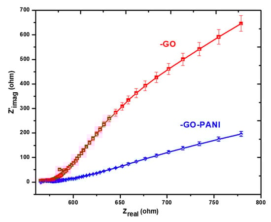 Further, the EIS analysis was considered to investigate the charge/transfer resistance activities of the prepared anodes in BMFCs operation. The Nyquist-EIS design was studied in the 100 kHz to 100 mHz frequency range with 1.00 mV AC amplitude. It reduced the biofilm disturbance during EIS analysis and stopped the biofilm detachment effect [54]. Figure 9 shows the observed Nyquist-EIS plot for the GO and GO-PANI anodes, which were affected by kinetic reaction and diffusion with solution resistance (Rs) and charge-transfer resistance (Rct). The EIS spectra usually showed that the straight line with higher Z`img (Ohm) demonstrated low electron transfer, while bent or lower Z`img (Ohm) showed high electron transportation. According to reported results, the GO-PANI showed lower electron resistance in solution than GO. It showed high electron mobility because it showed low (750 Ω) internal resistance in solution. The lower internal resistance referred to the high electron transportation between the electrode and solution. However, the GO showed high internal resistance, which decreased the electronic mobility between the solution and anode. This study concluded that the low internal resistance showed a high rate of kinetic reaction with low charge resistance. This feature demonstrated that the GO-PANI is preferable to enhance the electron transfer rate for high energy performance.