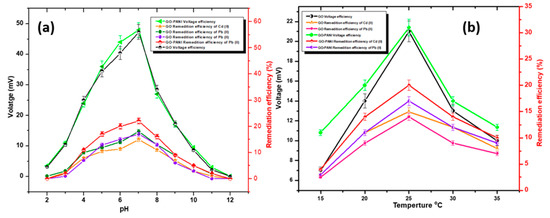Temperature also showed a significant effect on energy performance via BMFCs. The energy performance was observed at different temperatures. A variation in energy performance was observed at different temperatures. The present study was optimized from the 15 °C to 35 °C range, as shown in Figure 11b. The results showed that 25 °C offered a voltage of 21 mV for GO and 31 mV for GO-PANI, while performance at the temperature of 20 °C or 30 °C showed less energy efficiency as compared to 25 °C. The performance at a temperature of 35 °C also showed voltages of 10 mV and 12 mV for GO and GO-PANI, respectively. The energy performance varied at different temperatures, which can be interpreted in the way that temperature can disturb the biofilm and bacterial activities. The present study is more prominent and encouraging because the high-quality electrode and natural potato waste as an organic substrate empowered the bacteria to respirate, which showed some results. This means that the BMFCs can work below 20 °C with an efficient organic substrate. Similarly, at 25 °C the GO anode showed a remediation efficiency of 15% and 14% for Cd and Pb, respectively. However, the performance observed below 20 °C showed a remediation efficiency of 3 (Cd) and 2.5% (Pb), which is quite low, but this feature urged the improvement of the BMFCs to work under an unstable environment. The increment in temperature during the BMFCs operation disturbed the growth of biofilm and its activities. Mizan et al. [70] clearly stated in their work that the formation and activities of biofilm were declined at temperatures over 25 °C or below 20 °C. They preferred room temperature for the healthy growth of biofilm and for better efficiency. Previously, Li et al. [71] also studied the effect of temperature on microorganisms by operating different ranges of temperature. They also explained the detailed mechanism regarding the effect of temperature on biofilm from 10 °C to 55 °C. They recorded 2.64 W/m3 power density at 10 °C, and no power was recorded at 55 °C. They observed 6.34 W/m3 power density at 30 °C. In conclusion, they mentioned that room temperature or slightly higher, such as 24 °C to 30 °C, is better for exoelectrogens’ survival in the MFCs. In the present study, it has been observed that room temperature offered better removal efficiency as well as energy output as compared to other ranges of temperature. This can be observed in the case of GO-PANI, which also showed the highest remediation efficiency of Cd (20%) and Pb (17%) at 25 °C. The composite electrode showed quite high remediation and energy performance compared to unmodified GO, which might be due to the introduction of PANI. This means that PANI can increase the biocompatibility and electron transportation. All temperature range readings were taken after a time interval of every 10 days.