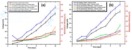 Effect of (a) potato waste and (b) tapioca waste as organic substrates on energy generation and remediation efficiency via BMFCs.