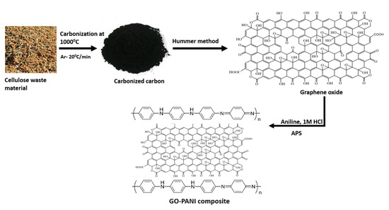 A nanocomposite of GO-PANI was prepared by mixing an equimolar of APS and aniline with 100 mL GO solution in order to obtain the homogeneous solution. The aniline was dispersed in 1 M hydrochloric acid. The reaction solution was sonicated for 60 min and then placed in an oven for one day at 25 °C. The obtained solid product of GO-PANI nanocomposite was washed several times by using the distilled water to remove the impurities. Previously, Zheng et al. [25] have also explained GO-PANI nanocomposite preparation by using a similar trend. The biomass conversion to GO-PANI nanocomposite is shown in Scheme 1.