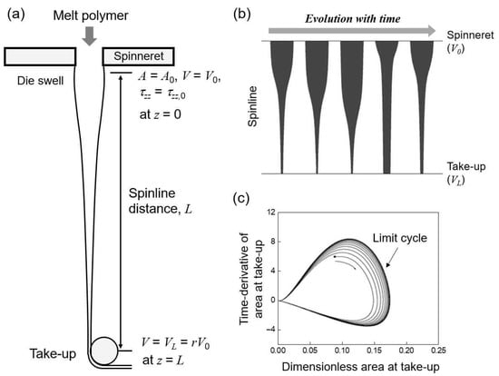 Fiber spinning is one of the representative extensional deformation polymer processes, fabricating highly oriented fibers with large drawdown ratios () of velocities at the take-up () and spinneret () positions in the spinline (Figure 1a) [1]. The product quality and processability of the fibers are greatly influenced by the rheological properties of the polymeric filaments and spinline conditions. The most important concern to ensure the uniformity of the fibers is the stability of the spinning flow in the spinline from the spinneret to the take-up positions. The well-known instability in the spinning flow is draw resonance that is characterized by self-sustained periodic oscillations of state variables such as fiber diameter and spinline tension (Figure 1b), when the drawdown ratio exceeds the critical value. This was first observed by Christensen [2] and Miller [3]. Subsequently, various theoretical and experimental developments on this phenomenon were reported in melt spinning processes with various complex fluids such as Newtonian, viscous, and viscoelastic ones [4,5] using linear stability analysis [6,7,8,9,10], direct transient responses [11], kinematic traveling waves [12,13,14,15], bifurcation theory [16,17], and experimental observations [18,19].