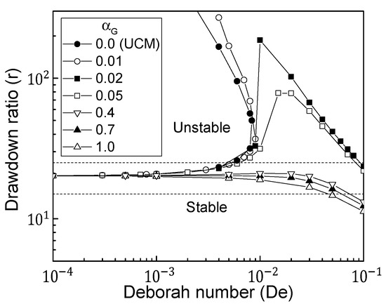 As illustrated in Figure 2, the critical drawdown ratios for Giesekus fluids were determined from the first normal mode of the linearized spinning systems, when De and were varied. The extensional properties (extensional-thickening or -thinning) of fluids played a significant role in the stability of various spinning processes. Unlike other viscoelastic models such as White–Metzner and PTT fluids [8,31], the Giesekus fluid exhibited interesting stability patterns depending on the value of . Three stability patterns can be shown in Figure 2. When was less than about 0.01, De rendered the system more stable implying that the critical drawdown ratio increased with increasing De and a secondary stable region at high draw ratios was observed, as in the typical extensional-thickening case (e.g., LDPE) of an upper-convected Maxwell (UCM) fluid with = 0. It is noted that the PTT fluid under extensional-thickening conditions did not show the secondary stable region [31].
