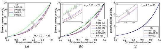 The aforementioned neutral stability curves for various values of are basically associated with the extensional behavior and properties in the spinline. First, the steady velocity profiles around the onsets for varying De in three fluid cases ((a) = 0.01, r = 25; (b) = 0.05, r = 25; and (c) = 0.7, r = 15) were compared and are shown in Figure 3. The extensional-thickening fluid with = 0.01 showed a higher velocity level in the same spinline position, as De increased (Figure 3a), requiring less residence time along the spinline with increasing De. However, the spinline velocity profiles in Figure 3c for the case of the extensional-thinning fluid with = 0.7 were the opposite with respect to the previous case, i.e., gradually decreasing velocity level in the same spinline position with increasing De. For intermediate value of , the dependence of the steady velocity profiles on De was different around the first and second drawdown ratio onsets at low and high De regions, exhibiting a higher spinline velocity level near the first onset and subsequent lower velocity level around the second onset, as De increased (Figure 3b).