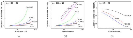 The extension rate () and apparent extensional viscosity () were evaluated from the steady velocity and tensile stress profiles in the spinline, respectively, under the spinning conditions shown in Figure 3. The apparent extensional viscosity rapidly increased with increasing De for the extensional-thickening case with = 0.01, as shown in Figure 4a. It must be noted that the non-zero value of in this case effectively prevents the infinite growth of tensile stress [32]. In the case of intermediate value of (Figure 4b), the growth rate of the extensional viscosity with increasing De is analogous to the case of = 0.01 around the lower onset, but not significant around the higher onset, as compared to that shown in Figure 4a. The extensional-thinning fluid (Figure 4c) showed decreasing extensional viscosity with respect to the extension rate and lower viscosity level with increasing De, as expected.