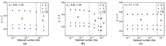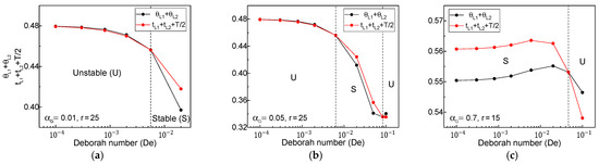 Figure 5 displays the changes in the LHS and RHS times (composed of the traveling times of two kinematics waves and period of oscillation) of the simple stability indicator (Equation (10)) with respect to De, to confirm the draw resonance onsets for three Giesekus fluids with = 0.01, 0.05, and 0.7. As De increased, the magnitude of the LHS and RHS times crossed exactly at critical points. For instance, the extensional-thickening case for = 0.01 was stable after a critical De = 0.00556 at r = 25; the intermediate case for = 0.05 was stable only in the range of De = 0.00633–0.0838 at r = 25; the extensional-thinning case for = 0.7 became unstable after a critical De = 0.0463 at r = 15. It was observed that these onsets were identical to those shown in Figure 1 obtained from the linear stability analysis.