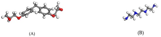 Herein, an all-atom model was employed as it is easy to implement. The model employed in Yu’s research [] is used here. The molecular structures of Bisphenol-F (DGEBF) resin and Triethylenetetramine (TETA) curing agent are shown in Figure 1.