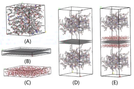 Molecular models of epoxy resin and its composites. (A) pure epoxy resin model consists of 15 represented units; (B) multi-layers graphene; (C) water molecule; (D) water layer; (E) initial model of epoxy resin enhanced by multi-layers layers graphene; and (E) initial enhanced system consisting of water molecules.