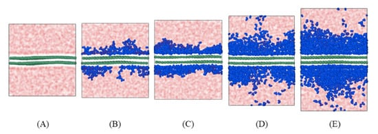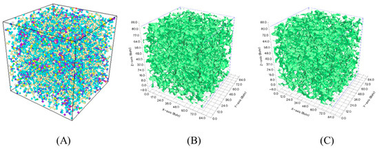 An amorphous cell composed of 30 representative molecules can be obtained by using the method chosen above. The crosslinking model with an initial density of 0.8 g/cm3 is shown in Figure 3A. The system was built at 298 K and under the periodic boundary conditions. Hereafter, a molecular model of composites with different humidity is required.