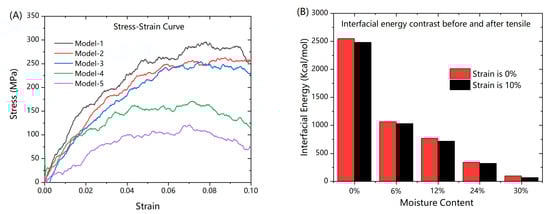 The stress-strain curves are shown in Figure 5A. Comparing curves in this figure, Young’s modulus and strength decreased with the increase in humidity. The evolution of interfacial energy, shown in Figure 5B, suggests that the value of absolute initial interface energy decreased with rise of humidity, and slightly amplified during the process of uniaxial tensile. This phenomenon indicates that the presence of water molecules at the interface reduces the bonding efficiency between the epoxy resin and graphene. Besides, stretching increases the distance between the epoxy resin and graphene, and this process leads to a lower interfacial energy.