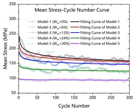 where S is the mean stress per cycle, N is the cyclic number, and a and b are the constant values. Notably, b can be regarded as the speed of the performance degradation and a can be regarded as the initial performance. Figure 6 shows the results of the relationship between the mean stress and cycle numbers.