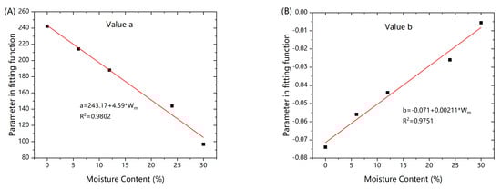 Comparing value a and b in each model with increase in humidity in Figure 7, the initial performance and the rate of performance degradation decreased. The performance of composites with high humidity was so poor that no more significant degradation occurs. The evolution of value a and b showed a linear relationship with the change of moisture content.