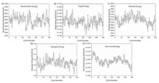 Total energy includes bond, angle, dihedral, improper, van der Waals, and coulomb energy. Among them, bond, angle, dihedral and improper belong to the bond energy, van der Waals and coulomb belong to non-bond energy. The cause of performance degradation can be analyzed by analyzing the evolution of energy. Herein, systems with different humidity were studied. The results of systems with humidity were almost the same as those of the system without humidity. Therefore, we have only displayed the results of the dry system to avoid figures too jumble. The evolution of individual potential energy is shown in Figure 8.