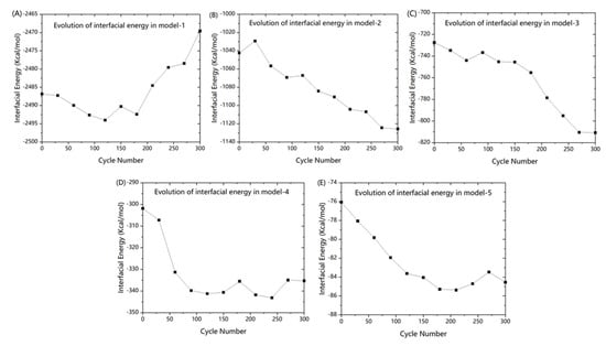 Interfacial energy can reflect the change in distance between the epoxy resin and graphene. The evolution of interfacial energy is shown in Figure 9.