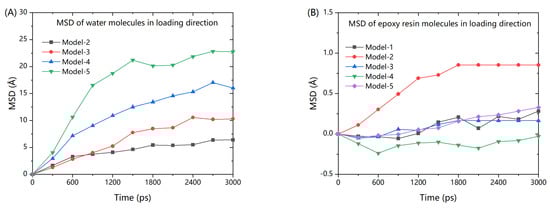 Mean-squared displacement of water molecules and epoxy resin molecules in the loading direction. (A) MSD of water molecules; and (B) MSD of epoxy resin.