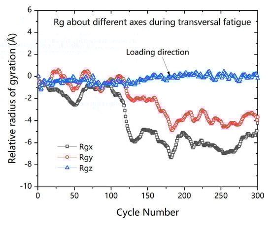 As per Figure 11, the radius of gyration about z-axis (loading direction) increased slightly with number of cycles, while the radius of gyration about other two axes were both decreased during the transversal fatigue. The results of Rg change during fatigue indicate that the molecular fragments tended to align along the loading direction during the fatigue cyclic loading. It can be considered as one of the reasons for performance degradation.