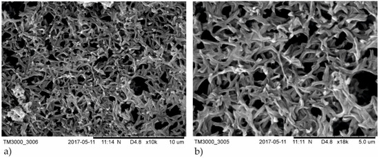 SEM images of the non-coated membranes: (a) magnification 10,000×, (b) magnification 18,000×.