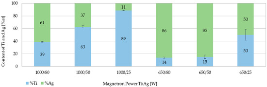 The elemental composition analysis included the assessment of the magnetron power effect on the percentage content for individual metallic elements in the elemental composition of the coating. The obtained results showed, that the TiO2 + AgO coatings (Figure 4) created at the higher magnetron power PMTi = 1000 W were characterized by a higher content of Ti compared to the coatings deposited at the power of PM-Ti = 650 W. The increase of the magnetron power PM-Ag resulted in the increase of Ag content in the elemental composition of the tested coatings.