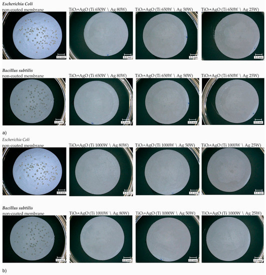 The antibacterial activity of membranes modified by TiO2 + AgO coatings was specified against two representative bacteria such as Escherichia coli (E.coli) and Bacillus subtilis (B.subtilis), respectively. The coatings generated with the following power of magnetron source (PM-Ag = 25 W, 50 W and 80 W, PMTi = 650 W and 1000 W) lead to the complete growth inhibition of the colonies of E.coli and B.subtilis on the membranes which is shown in Figure 5. Both bacteria showed no growth on the agar plates after incubation.