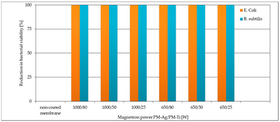Reduction [%] CFU counts of Escherichia coli and Bacillus subtilis on no-coated membrane and membranes covered with TiO2 + AgO coating deposited during 30 s at different magnetron powers PM-Ti and PM-Ag.
