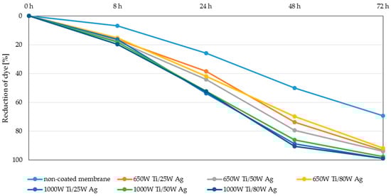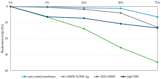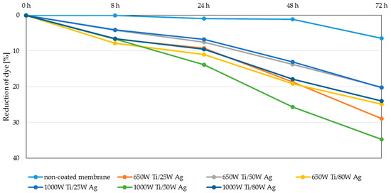 As shown in Figure 7 the membranes with TiO2 + AgO coatings deposited with the magnetron power PM-Ti = 1000 W showed better photocatalytic properties after irradiation UV lamp than the coatings deposited with the magnetron power PM-Ti = 650 W (Figure 7). For all types of coatings with PM-Ti = 1000 W over 90% reduction of the dye was achieved after 72 h. The literature and own research data show that titanium oxide is a substantial photocatalytic factor in UV light [32,33]. The doping of the coatings with silver oxide (AgO) for bactericidal and photocatalytic properties in visible light does not negatively influence photocatalytic properties under UV light.