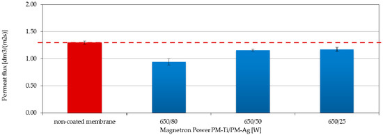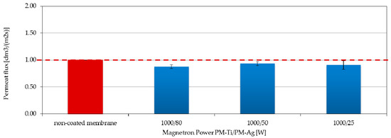 The results of the filtration and transport properties analysis for polymer membranes coated with two-component TiO2 + AgO coatings showed an inconsiderable decrease in the permeate flux compared to the native membrane (Figure 10 and Figure 11). The highest (27%) decrease in the permeate flux compared to the native membrane was recorded (Figure 10) in the case of the membrane with the coating deposited at the magnetron powers PM-Ti = 650 W and PM-Ag = 80 W. Reducing the power of the PM-Ag magnetron resulted in an improvement of the permeate flux. After increasing the magnetron power to PM-Ti = 1000 W, a significant improvement in the filtration properties was observed. The permeate flux was comparable to the non-coated membrane (Figure 11) for the membrane with the coating deposited at the magnetron powers PM-Ag = 25 W and PMAg = 50 W.