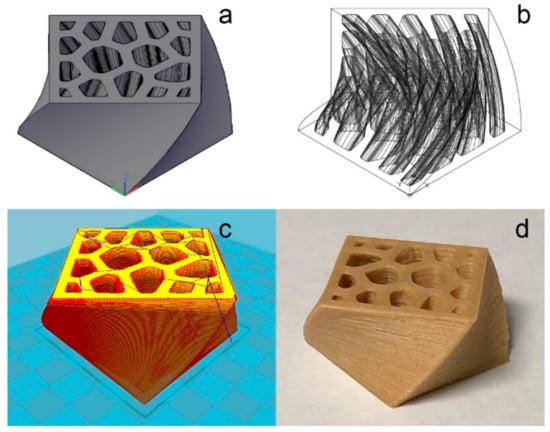 An illustration of the typical AM process. (a) 3D model of the desired product; (b) “wireframe” display of the desired product; (c) model after slicing into layers by the CURA software; (d) desired product constructed using fused deposition modeling (FDM) 3D printing.