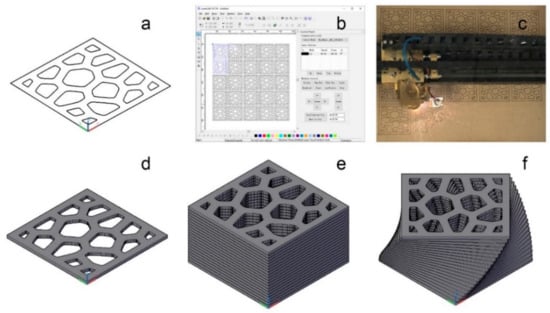 Model design methodology. (a) Outline of a Voronoi cellular-patterned cross-sectional layer; (b) Setting laser-processing parameters in the LaserCAD software, such as laser power, moving speed, etc.; (c) Laser-cut wood; (d) A layer slice after 1.5 mm of extrusion; (e) Stacking of layers along the Z-axis to create a layered model; (f) Layers are rotated to produce the model of the desired product.