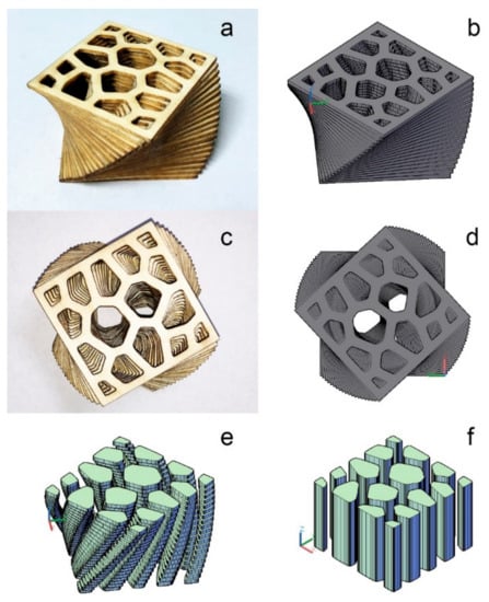 Furthermore, the surface area of tubular voids present in Figure 4e is 1.27 times the surface area of SM possible tubular voids in Figure 4f. The increased surface area in products with intricate geometrical structures, such as the product presented in Figure 4, could prove beneficial for the development of special-purpose, wood-based products. For example, the spacious tubular voids of complex LcVL-printed structures contain larger void surfaces and enable greater convenience for architecting desired tortuosity, which could improve sound absorption compared to standard SM possible structures []. Overall, as demonstrated by the printed product in Figure 4, LcVL was able to properly realize the 3D model of the desired product to a satisfactory degree. However, the LcVL method is not ideal for fabricating products with high angle overhangs without additional external support to ensure uniform pressure on each layer.