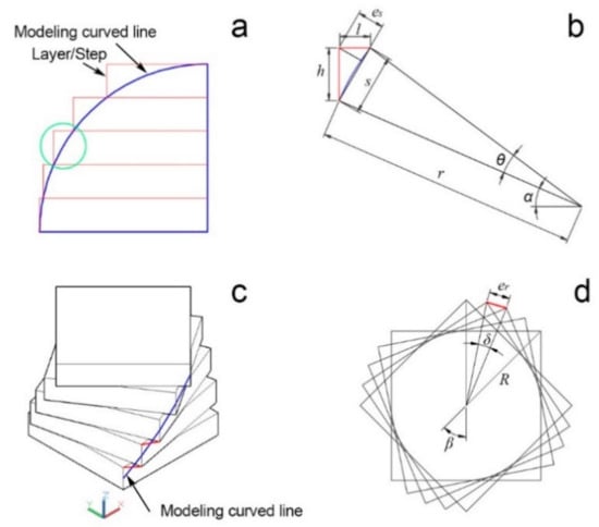 (a) Theoretical manufacturing error between contours of the modeling curve line and LcVL layer stacking; (b) Calculation parameters for the theoretical manufacturing error from LcVL layer stacking; (c) Theoretical manufacturing error between contours of the modeling curve line and postrotation LcVL layer stacking; (d) Calculation parameters for the theoretical manufacturing error from postrotation layer stacking.