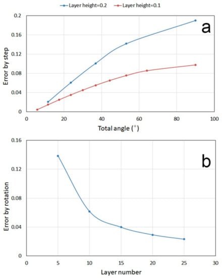 (a) Relation between layer height and theoretical manufacturing error (TME) from layer height, where total angle is the sum of α and θ; (b) Relation between layer number and TME from layer rotation.