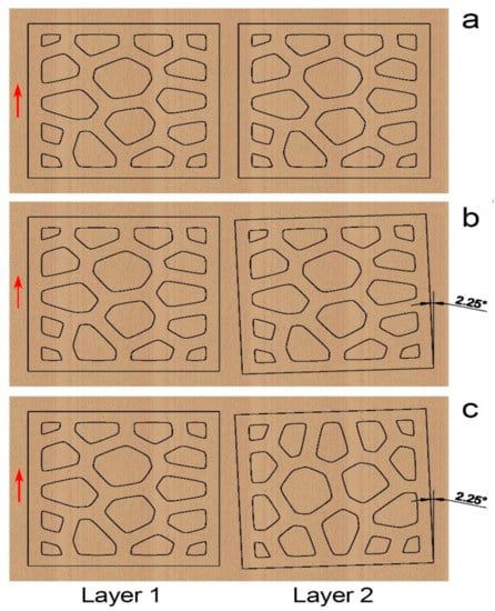The structural directionality of LcVL products could be designed through wood texture directions. The sample presented in Figure 4 was created by stacking identical layers with each layer rotated by 2.25°. As shown in Figure 7a, a pair of identically-cut layers share the same wood texture direction. Thus, since all layers are 2.25° offset from their adjacent layers, the wood texture directions of all layers are 2.25° apart in this sample. However, as shown in Figure 7b, if layer 2 was cut with a counterclockwise 2.25° rotation from layer 1, then the wood texture direction of layer 2 would be 2.25° clockwise from layer 1. Thus, if such layer pairs were laminated together with a 2.25° counterclockwise layer-to-layer increment, the resulting product would have consistent wood texture direction. Alternatively, if layer 2 was cut with a 90° counterclockwise plus 2.25° counterclockwise rotation, as shown in Figure 7c, then the wood texture directions of layers 1 and 2 would be orthogonal in a product with 2.25° counterclockwise-rotated layers. The directionality of such a product could be analyzed with the orthogonal principle of plywood technology. The designability of LcVL-product structures is essential for creating material templates and matrices for composites of varying properties with LcVL.