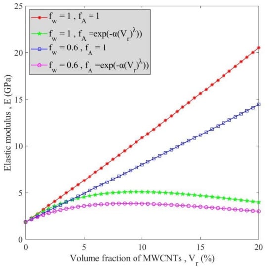 Waviness, random orientation, and agglomeration factors can significantly influence the value of elastic modulus. The mentioned factors can be considered through the following equation []:
