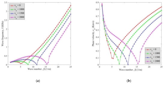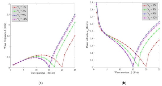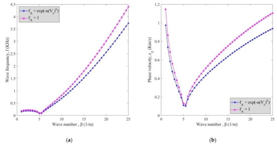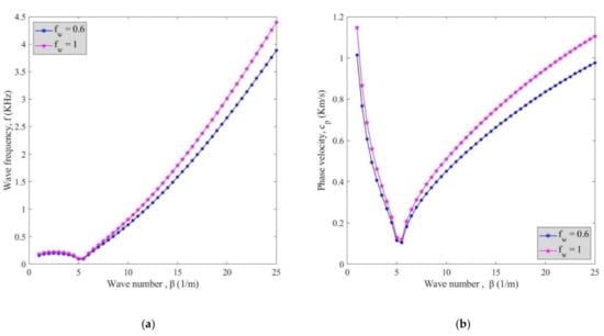 The effect of waviness factor on the changes of wave frequency (a) and phase velocity (b) against wave number is surveyed in Figure 5 at Vr = 5%. To clarify the effect of waviness factor on wave frequency and phase velocity, agglomeration factor, and fluid flow velocity were not taken into account. The waviness factor descended the variation of phase velocity and wave frequency. Moreover, by rising the wave number, phase velocity first declined and then grew after damping wave number (β = 6).