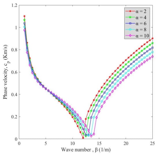 Variation of phase velocity with the wave number is demonstrated in Figure 7 for various agglomeration degrees (α) at vx = 2000 and Vr = 5%. Noteworthy, the growth of parameter α exhibited a greater influence of the MWCNT aggregated state on the response of nanocomposite; thus, phase velocity values are diminished by choosing greater values for parameter α. Also, the damping effect occurred at higher wave numbers in cases with higher α parameter values. Thereupon, wiping out the agglomeration of MWCNTs is indispensable if the full potential of MWCNT reinforcements is to be realized.