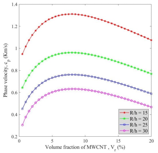 Figure 8 illustrates the variation of phase velocity versus MWCNTs’ volume fraction for different radius to thickness ratios has at vx = 2000, Vr = 5%, and β = 25. As can be seen, this ratio had a decreasing influence such that the phase velocity increased by the decline of the radius to thickness ratio. In other words, the phase velocity is reversely proportional to the radius to thickness ratio. The softening effect caused by the increment of radius to thickness ratio can explain this behavior. At a constant radius to thickness ratio, an enhancement in the MWCNT content raised the phase velocity to its maximum value followed by a gradual decrease which can be assigned to the agglomeration factor.