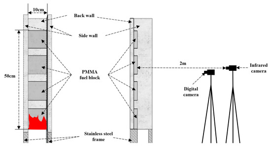 - Tsai, K.-C. Width effect on upward flame spread. Fire Saf. J. 2009, 44, 962–967. [Google Scholar] [CrossRef]