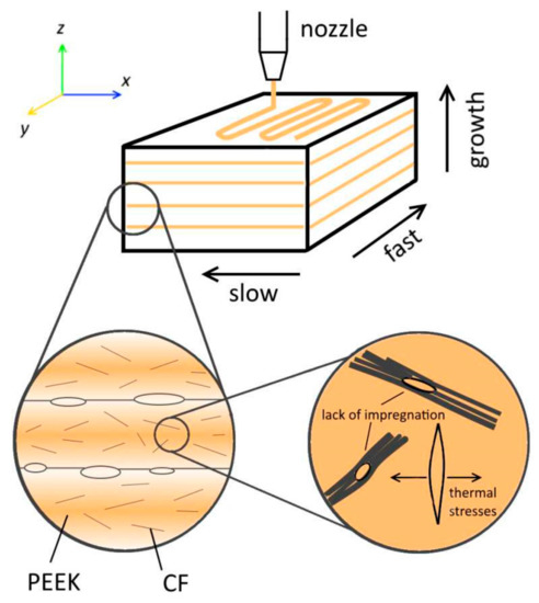 - Stepashkin, А.; Chukov, D.; Senatov, F.; Salimon, A.; Korsunsky, A.; Kaloshkin, S. 3D-printed PEEK-carbon fiber (CF) composites: Structure and thermal properties. Compos. Sci. Technol. 2018, 164, 319–326. [Google Scholar] [CrossRef]