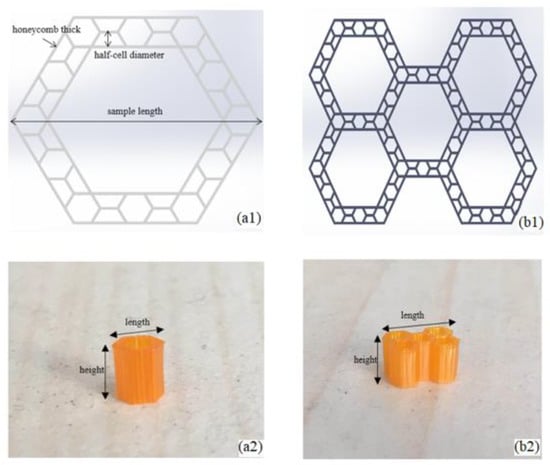 Currently, many scholars studied the mechanical properties of honeycomb under different topologies using experimental and numerical simulation methods [,,,]. Hohe et al. [,] studied the elastic response of hexagonal, triangular, and quadrilateral honeycomb structures. Zhen et al. [] numerically studied the dynamic mechanical properties of irregular random honeycomb structures under in-plane impact. Yamashita [] analyzed the impact behavior of different cell honeycomb specifications with numerical and experimental methods. Zinno et al. [] analyzed the multi-scale approach for the design of composite sandwich structures for train application. Wu and Jiang [] studied the experimental results of six honeycomb structures under quasi-static load and axial load. Reza et al. [] studied the in-plane compression mechanical properties of hexagonal honeycomb based on additive manufacturing technology by comparing experimental and calculated results. Different cell configurations [,,,,,] have been developed and explored over the years. To determine the relationship between compressive strength and cell size, some studies [,,,] found that changing some cellular size parameters could increase the compressive strength of the structure, thereby improving the mechanical properties of the honeycomb structures. Anna et al. [] studied the energy absorption of honeycomb with regular cellular structures by 3D printing through static and dynamic loading. Many studies have shown that the mechanical and energy absorption properties of honeycomb largely rely on its cellular configuration and base material’s properties. At present, based on the printing of existing material models and the construction of composite materials, 3D printing has seen some new applications. Kozior et al. [] studied to improve the mechanical stability of an electrospinning nanofiber mat, which was combined with 3D printing technology to prepare a mechanically stable filter with a nanofiber surface. This study showed that the nanofiber mat had a strong adhesion to 3D printed scaffolds from thermoplastic polyurethane (TPU). At the same time, the adhesion of three-dimensional printing on textile fabrics [] described the improvement of textile/polymer adhesion based on experimental research on adhesion in 3D printed textile/polymer composites and theoretical research on adhesion inside the 3D printed part.