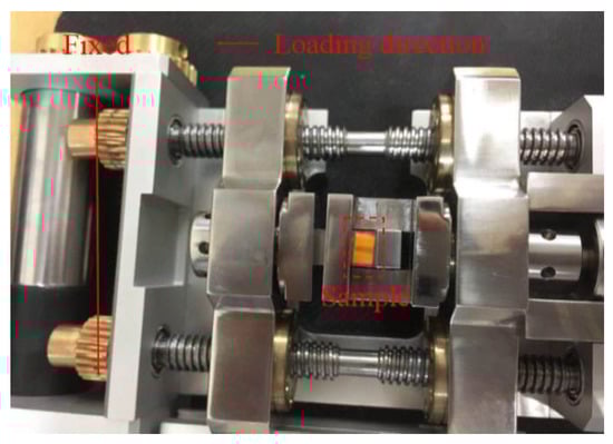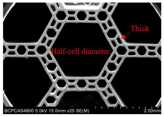 In this study, two different samples (single-level hierarchical honeycomb (SHH) with a size of 4 mm × 2.6 mm and multi-level hierarchical honeycomb (MHH) with a size of 4 mm × 6 mm) were fabricated as shown in Figure 1a,b. The resin honeycombs were manufactured by surface projection micron stereo-lithography technology (PμSL) technology (BMF Inc., Shenzhen, China) that meets the stereo lithography apparatus (SLA) technical standards in ISO/ASTM 52921 and had density in the range of 0.347–0.372 g/cm3 (the parameters of resin listed in Table 1 and Table 2), meaning a half-cell diameter of 0.14 mm and resin honeycomb 0.07 mm thick (see Figure 2). In view of the millimeter size of the samples, the in situ micro-compression loading test was performed by a MICROTEST2000 system (GATAN Inc., Pleasanton, CA, USA) with SEM (Figure 3). The system comprised a replaceable load sensor, a sample heater, a clamping device, and a compression head, and it is an important platform to observe and analyze the micro-deformation morphology and fracture mechanism of materials. The honeycomb samples were clamped between two compression heads with a dimension vision of 1 mm × 1 mm, such that an aperture of 0.28 mm diameter [] was exposed in the vision (Figures 8 and 9). We respectively observed the deformation of the honeycombs and the deformation of the apertures by axial compression and radial compression. Before testing, the upper compression head was given a fixed speed and the samples were fixed on the base. While observing the deformation of the samples by SEM, the information of the loading was recorded.