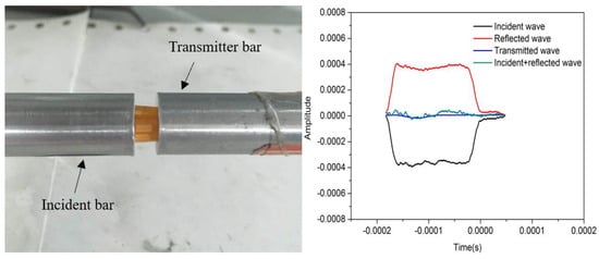 The Hopkinson pressure bar can realize loading experiments under a high strain rate (102–104 s−1), and it is widely used by scholars engaged in dynamic mechanical research and related fields [,,]. The core parts of the Hopkinson pressure bar device are two separate elastic waveguide bars (the incident and the transmitted bar). The sample is clamped between the two bars. The loading pulse is generated by the striker bar hitting the incident bar. The device is shown in Figure 4. An incident stress wave with a wavelength twice the length of the striker bar will be generated in the incident bar. When the incident stress wave reaches the sample, part of it is reflected back to the incident bar, and other part passes through the sample and reaches the transmitter bar. The transmitted stress wave is captured by the absorption bar and finally absorbed by the energy harvester. As shown in Figure 5, the signals of the incident wave, the reflected wave, and the transmitted wave have three amplitudes εI, εR, and εT, respectively. From these three signal values, we can deduce the stress–strain relationship of the sample [].