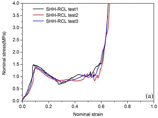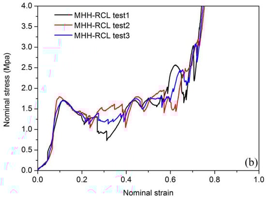 Nominal stress–strain curve of radial compression loading (RCL): (a) SHH-RCL test, (b) MHH-RCL test.