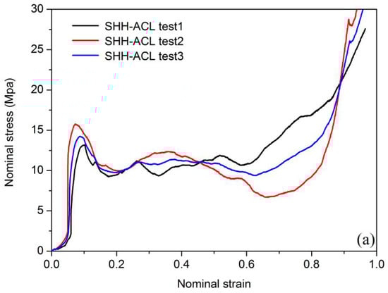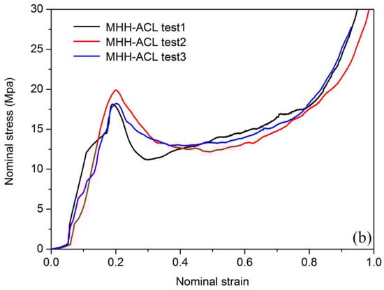 Nominal stress–strain curve of axial compression loading: (ACL) (a) SHH-ACL test, (b) MHH-ACL test.