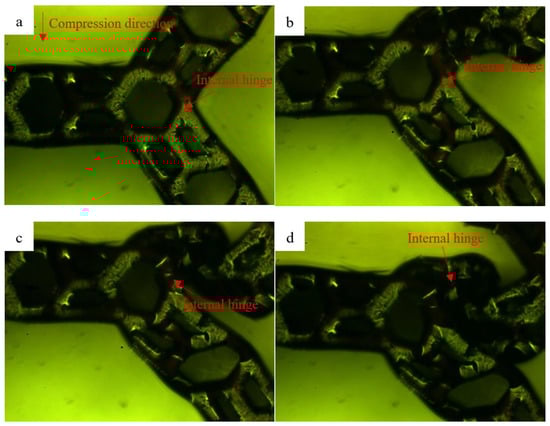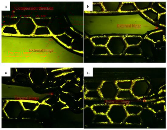 In order to visually observe the compression deformation process of the multi-level honeycomb, we selected the deformation process perpendicular to the displacement direction of the vision. Figure 8 and Figure 9 show the SHH material overall deformation process and MHH material local hinge deformation process, respectively. As shown in Figure 8, the first that started was the distortion of SHH external hinge. As the compression increased further, the honeycomb holes of the external hinge were twisted into clusters. When the crushing was over, the honeycomb holes on the upper and lower contacting with surfaces of the indenter would be distorted. As shown in Figure 9, the honeycomb hinge parallel to the surface of the indenter does not undergo significant deformation. Conversely, the angled internal hinges of honeycomb on both sides appear to be deformed as the crushing progresses and finally twisted into clusters.